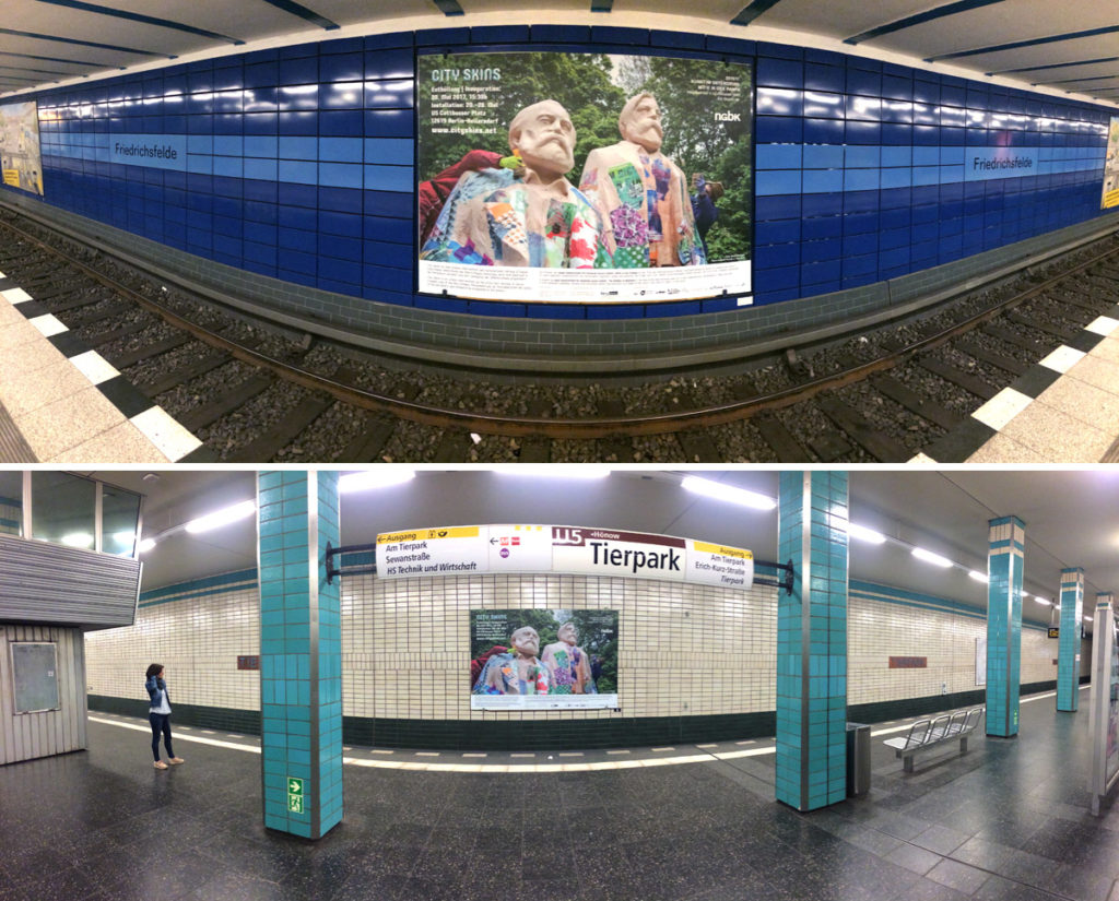 Auch auf den Hintergleisflächen der Bahnhöfe Weberwiese, Friedrichsfelde und Tierpark entlang der Linie U5 können die beiden nun bewundert werden. Haltet die Augen offen!